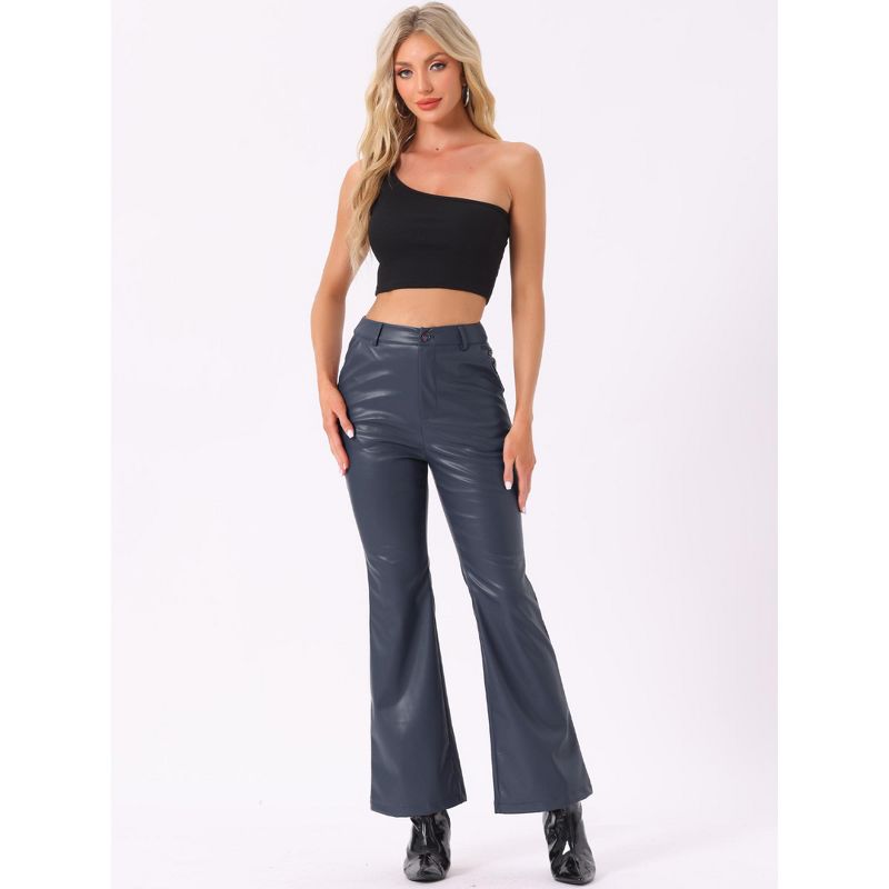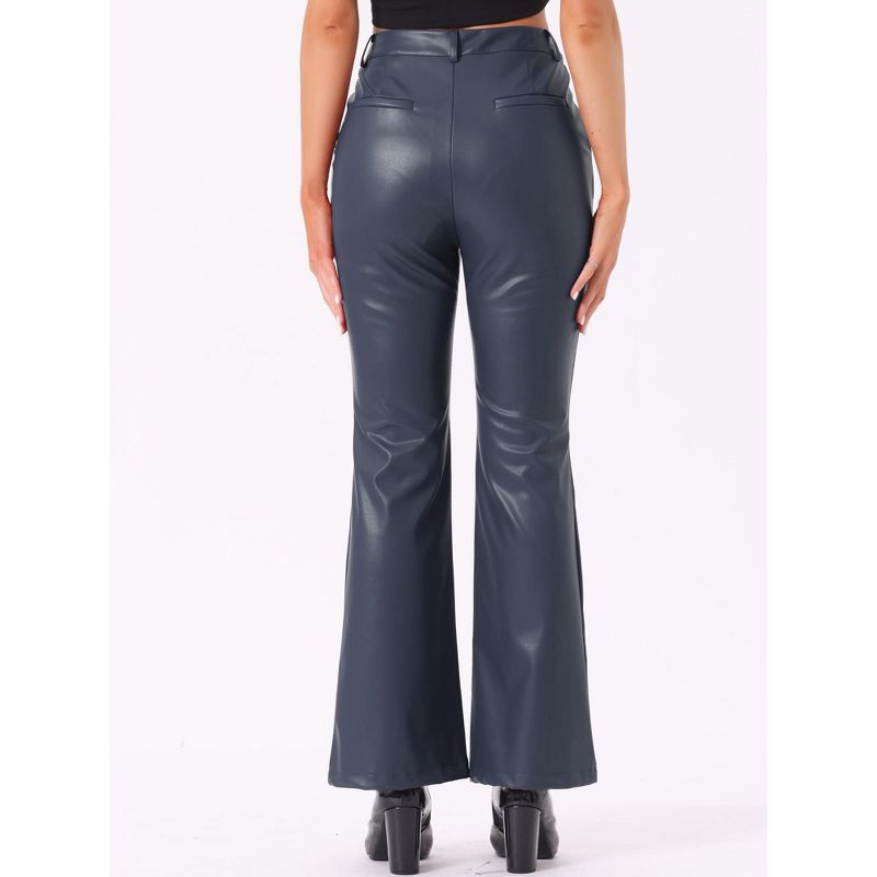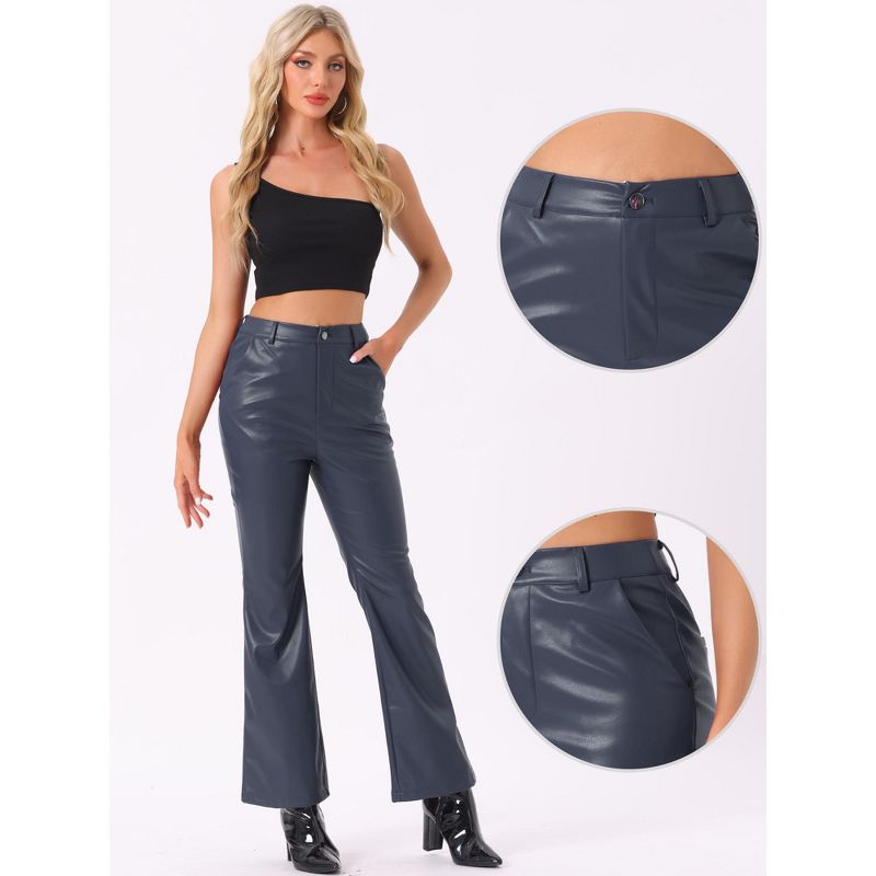 INSPIRE CHIC Women's High Waist Bottom Flared Faux Leather Pants With Pockets Dark Blue Small