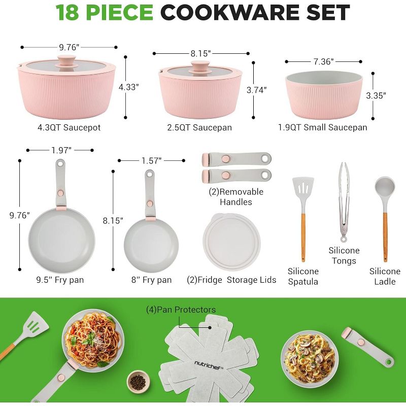 NutriChef 18-Piece Stylish Kitchen Cookware Set – Ceramic Nonstick Pots & Pans with Detachable Handles (Pink)