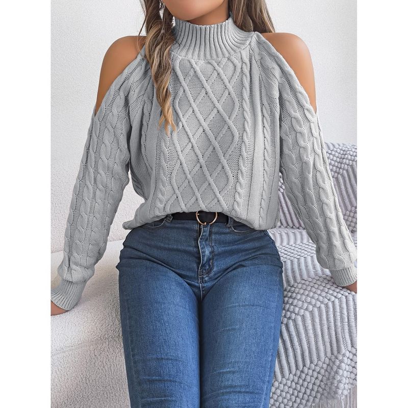Clearlove Women's Off The Shoulder Sweater Cable Knit Long Sleeve Ribbed Fall Going Out Sweater Pullover - Grey,X Large