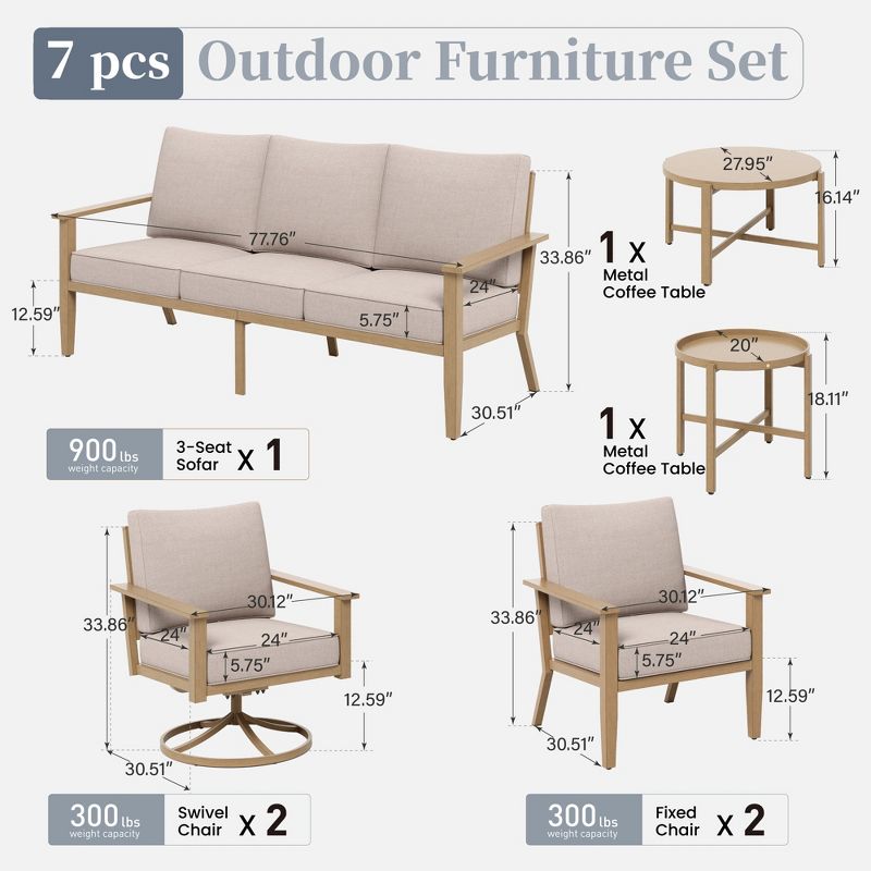 Captiva Designs 7PC Outdoor Patio Cross-Band Back Conversation Set with Thick Cushions for Deck, Garden, or Poolside