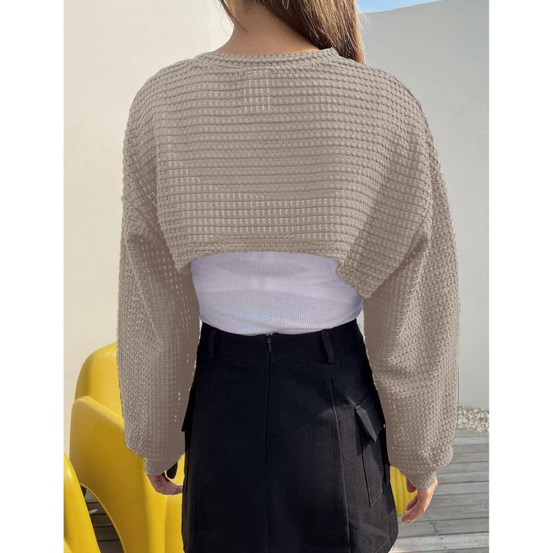 Womens Pullover Crochet Sweater Crew Neck Cropped Tops Shrugs Waffle Knit Crochet See Through Knit Top Cover Ups,Khaki - XL