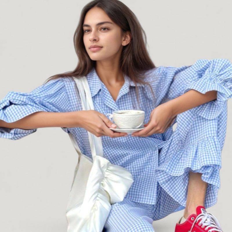 Anna-Kaci Lounge Women's Gingham Button Down Pajama Set with Long Sleeve Collared Top and Ruffle Hem Wide Leg Pants - Large, Blue