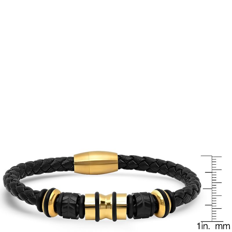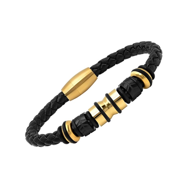 Steeltime Men's genuine black leather braided bracelet with 18k gold plated stainless steel accents. Color Options: Gold, Rose