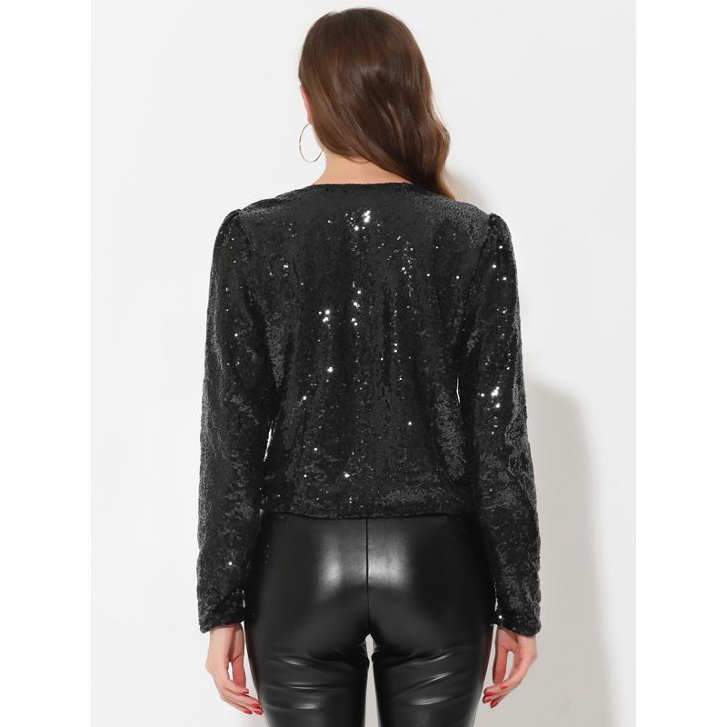Allegra K Women's Long Sleeve Sparkly Sequin Crop Open Front Jackets Black Large