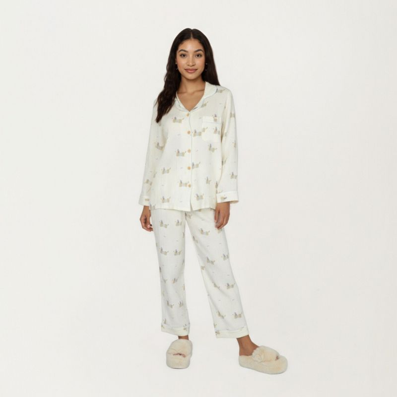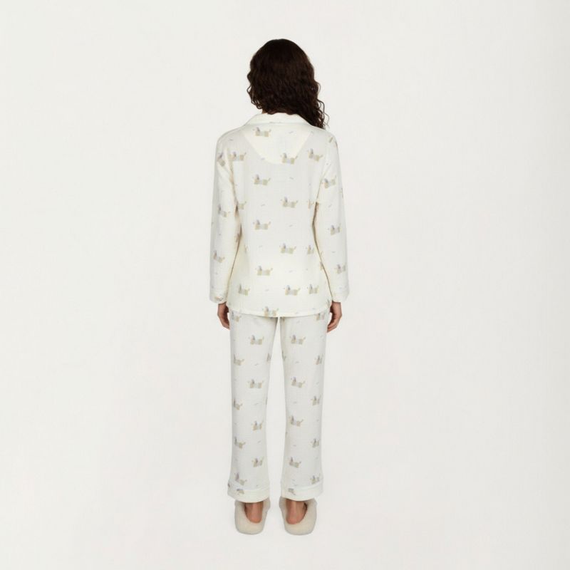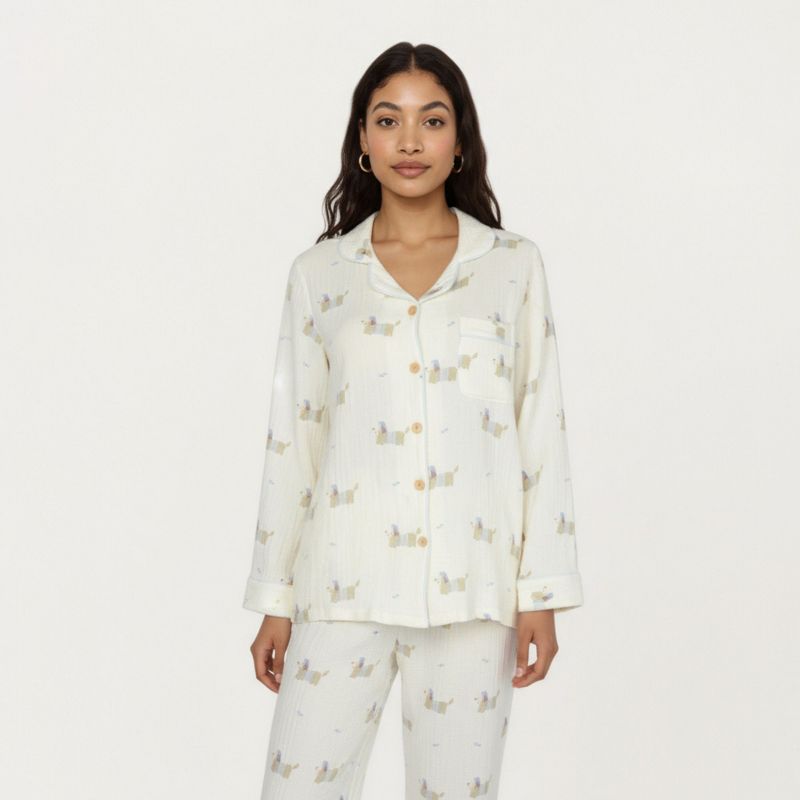 Anna-Kaci Lounge Women's 2-Piece Set Long Sleeve Button Front Top and Relaxed Fit Pants Pajama Set with Dog Print - Small, Light Beige