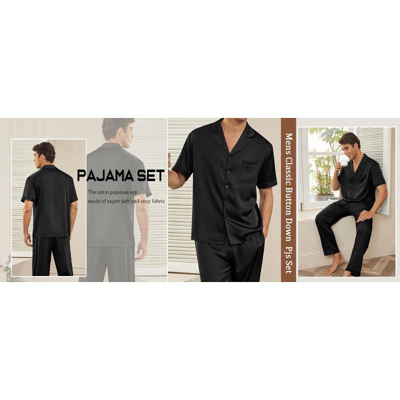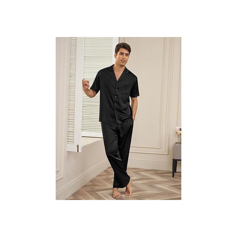 Ekouaer Men Satin Silk Pajamas Set 2 Piece Button Down Sleepwear Long Pants Loungewear with Pockets Black L Black L