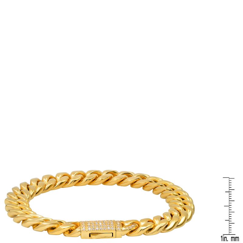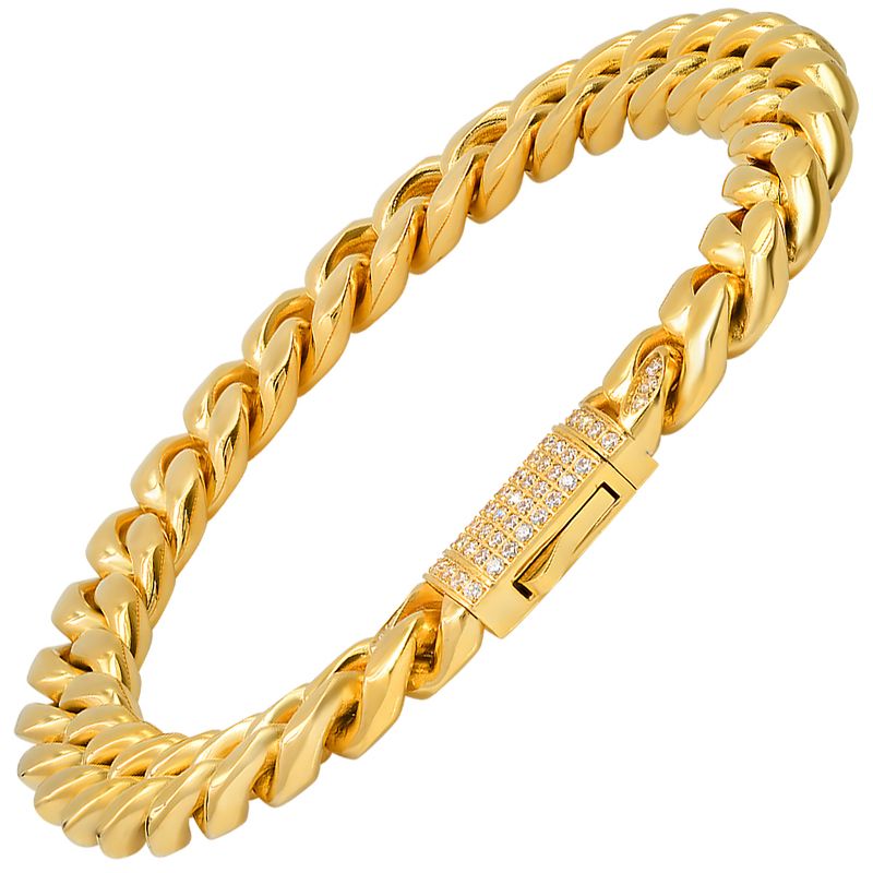 Steeltime Men's 18k gold plated stainless steel thick cuban link chain bracelet with simulated diamonds clasp. Color Options: Silver, Gold