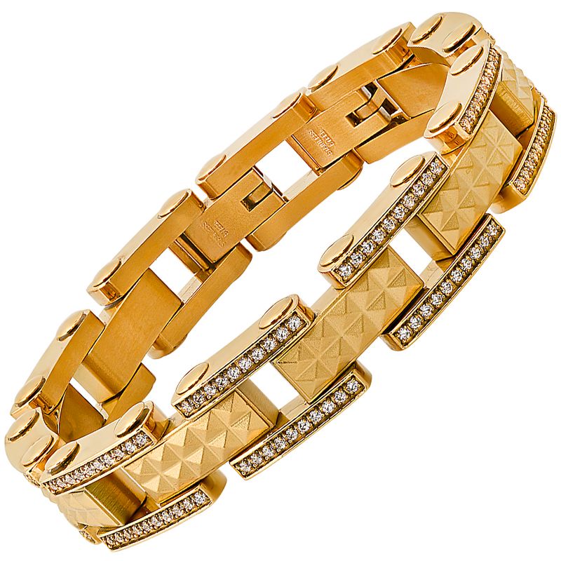 Steeltime Men's 18k gold plated stainless steel and simulated diamonds pyramid stud pattern link bracelet. Color Options: Silver, Gold