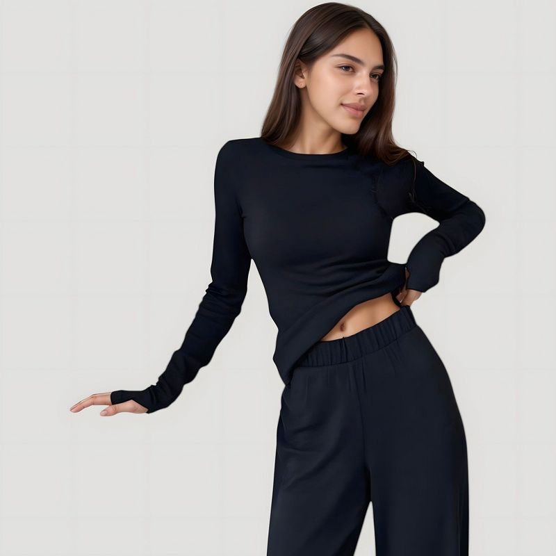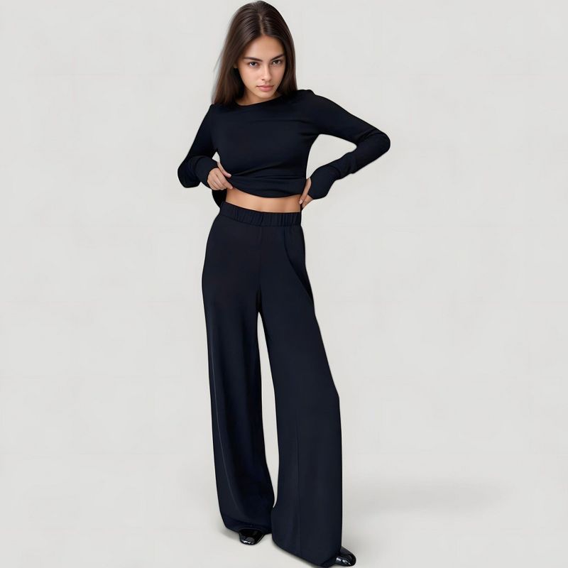 Anna-Kaci Lounge Women's Long Sleeve Woven Pajama Set with Fitted Crew Neck Top and Wide Leg Pants - Medium, Black