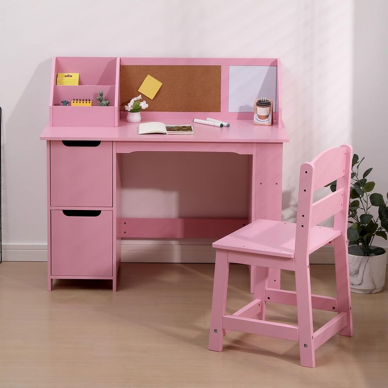 Kids Desk and Chair Set with Drawers, Wooden Children Table with Features Bookshelf/Bulletin Board/Cabinets, for Children Ages 3-8, Pink