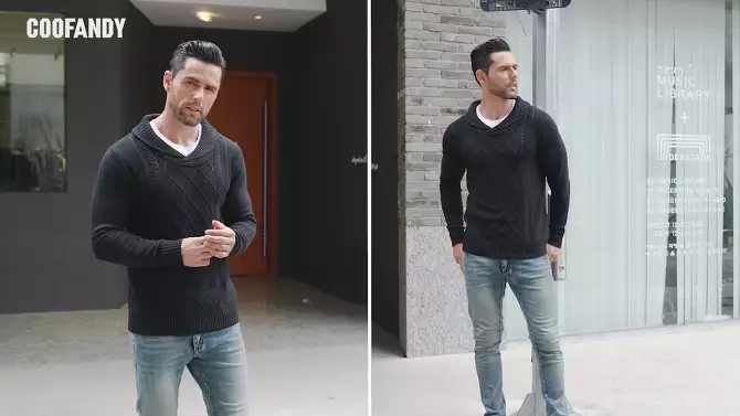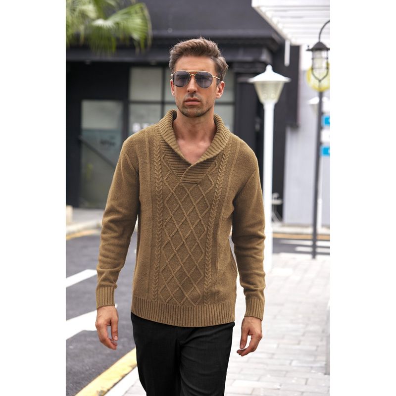 COOFANDY Men's Shawl Collar Sweaters V-Neck Relaxed Fit Cable Pullovers Blue S