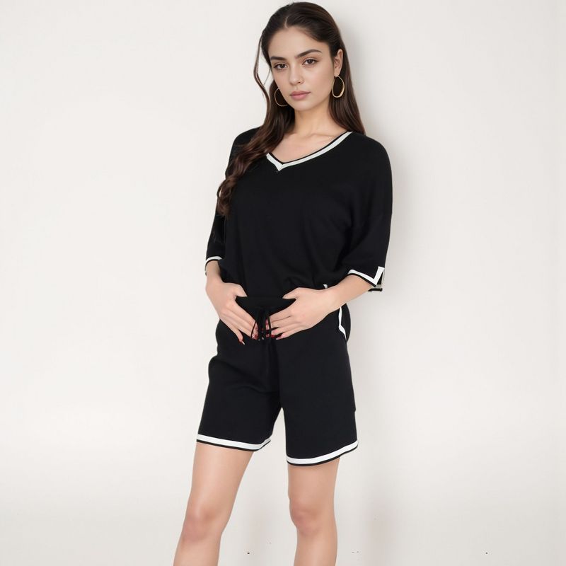Anna-Kaci Lounge Women's Knit Lounge Set with V-Neck Top and Drawstring Shorts Featuring Contrast Trim - Black, X Large