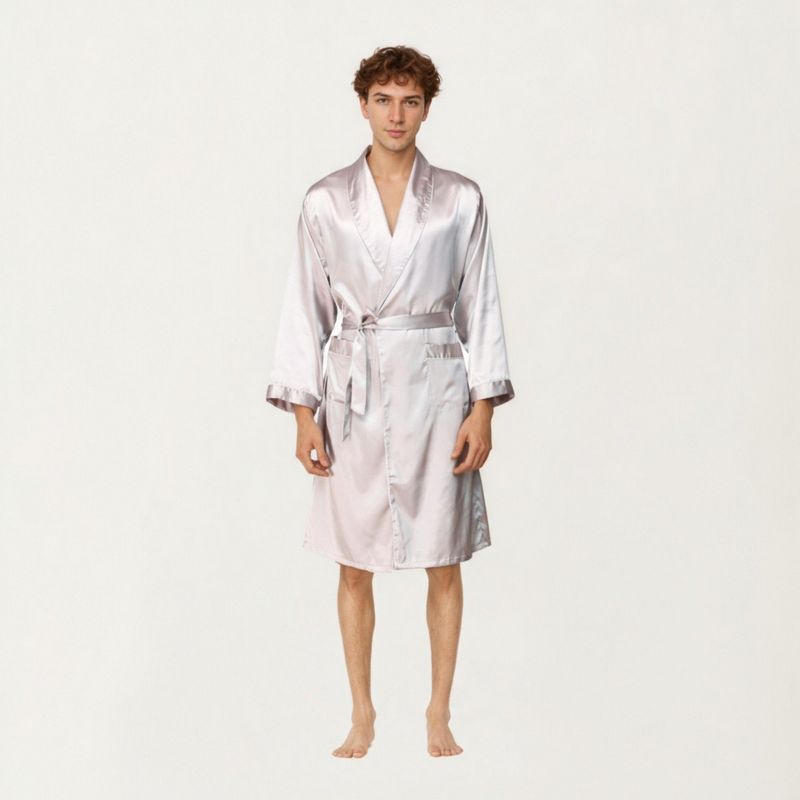 Anna-Kaci Lounge Men's Satin Robe with Shawl Collar Waist Tie and Front Pockets- Medium, Gray