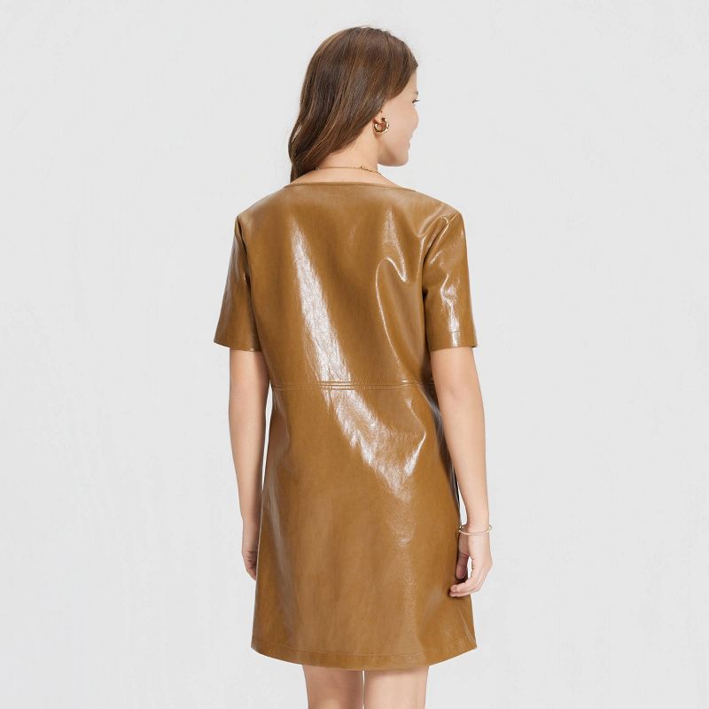 Women's Short Sleeve Faux Leather Mini Shift Dress - A New Day™ Caramel XS