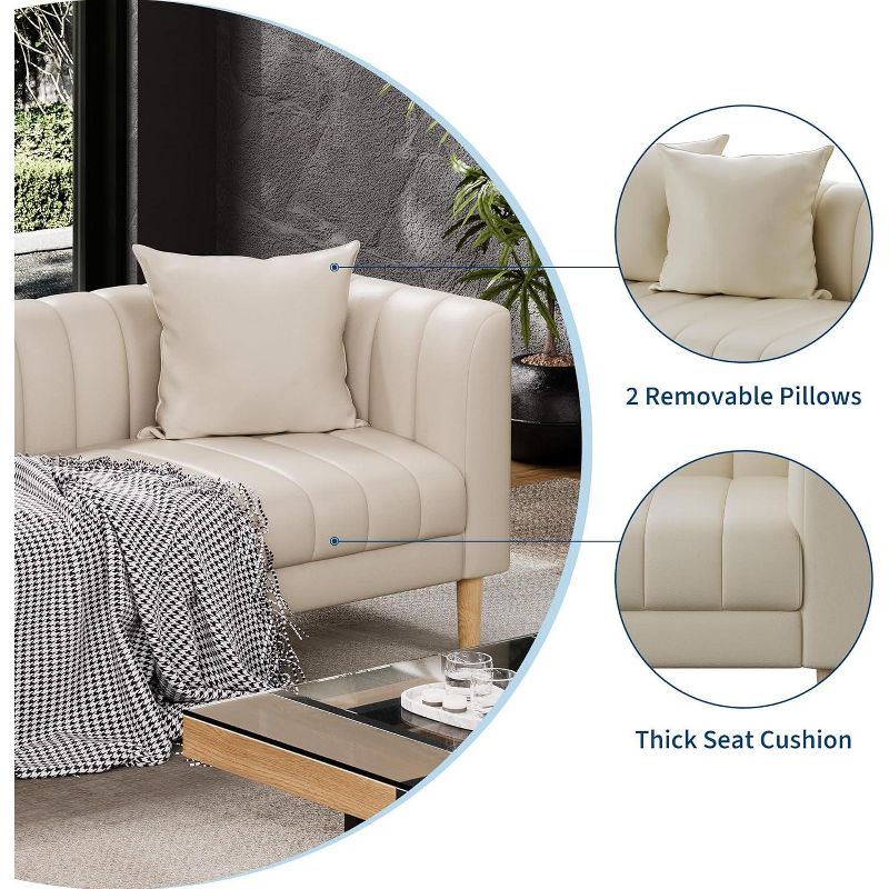 78" Faux Leather Sofa Couch, Modern 3-Seater with Deep Seats, 2 Throw Pillows, Wood Legs, for Living Room, Apartment or Bedroom, Beige