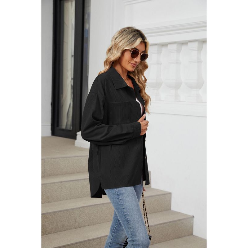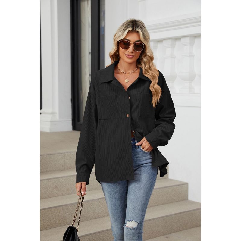 Clearlove Women's Corduroy Shirt Jacket Long Sleeve Pocket Button Down Collared Fall Outerwear Black L