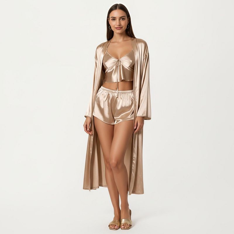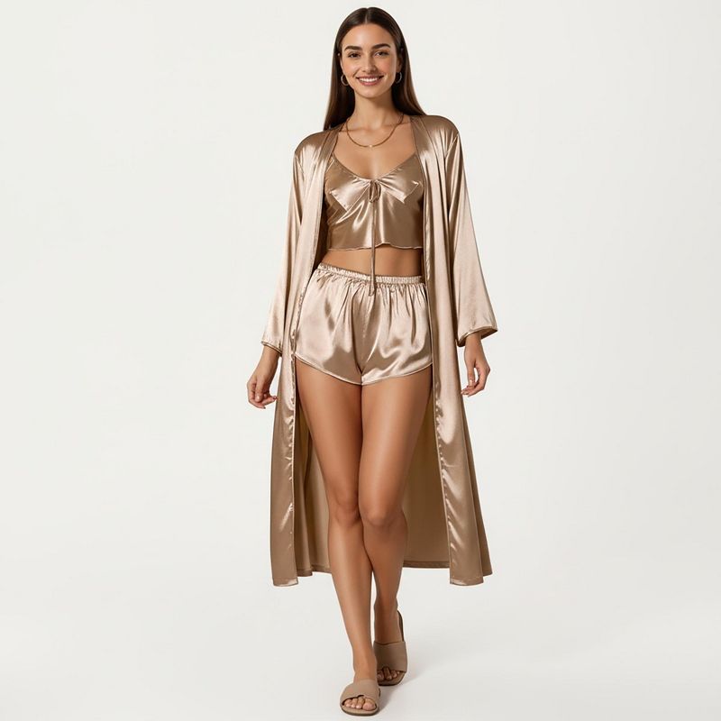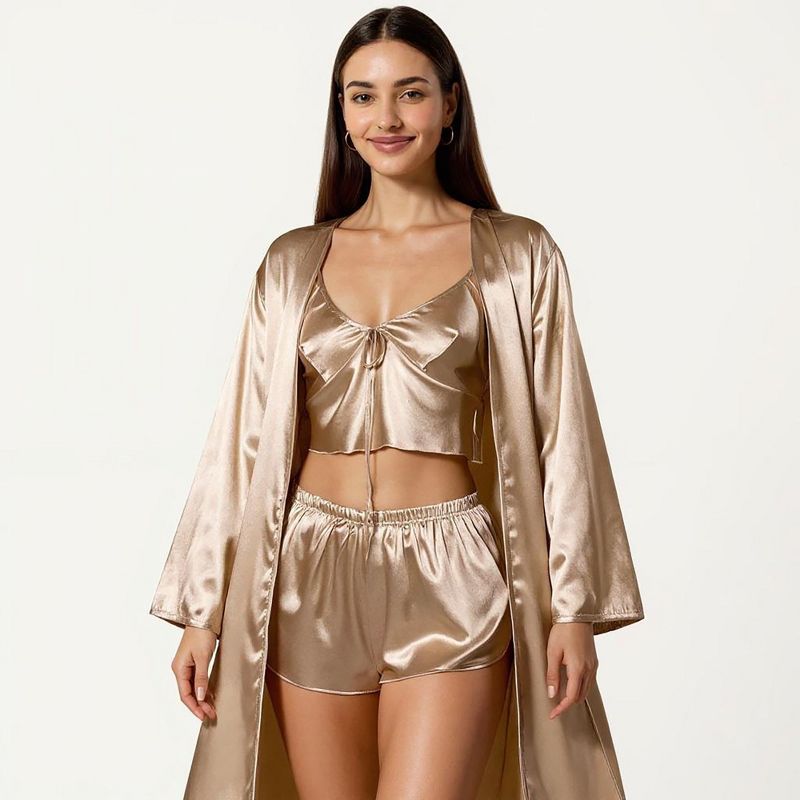 Anna-Kaci Lounge Women's Satin Pajama Set with Long Robe, Cami, Shorts, and Tie Waist- Khaki,Large