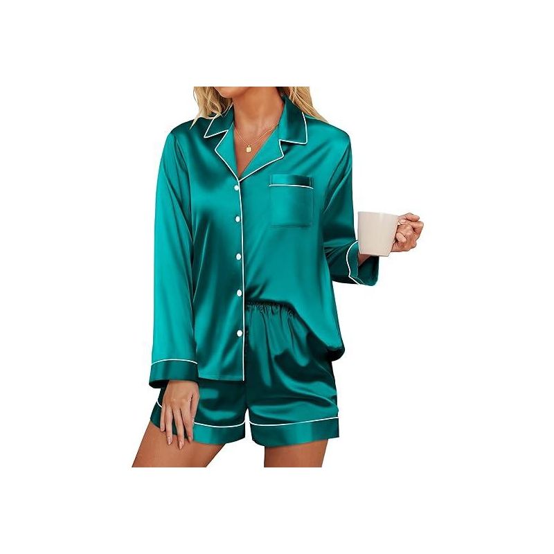 Ekouaer Satin Pajama Set for Women Button Down Pj Set Long Sleeve Top and Shorts 2 Piece Loungewear Summer Soft Sleepwear Clear Blue XL