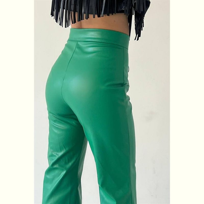 Women High-Waisted Lace-Up Wide-Leg Pants Faux Leather Trousers, Green, L