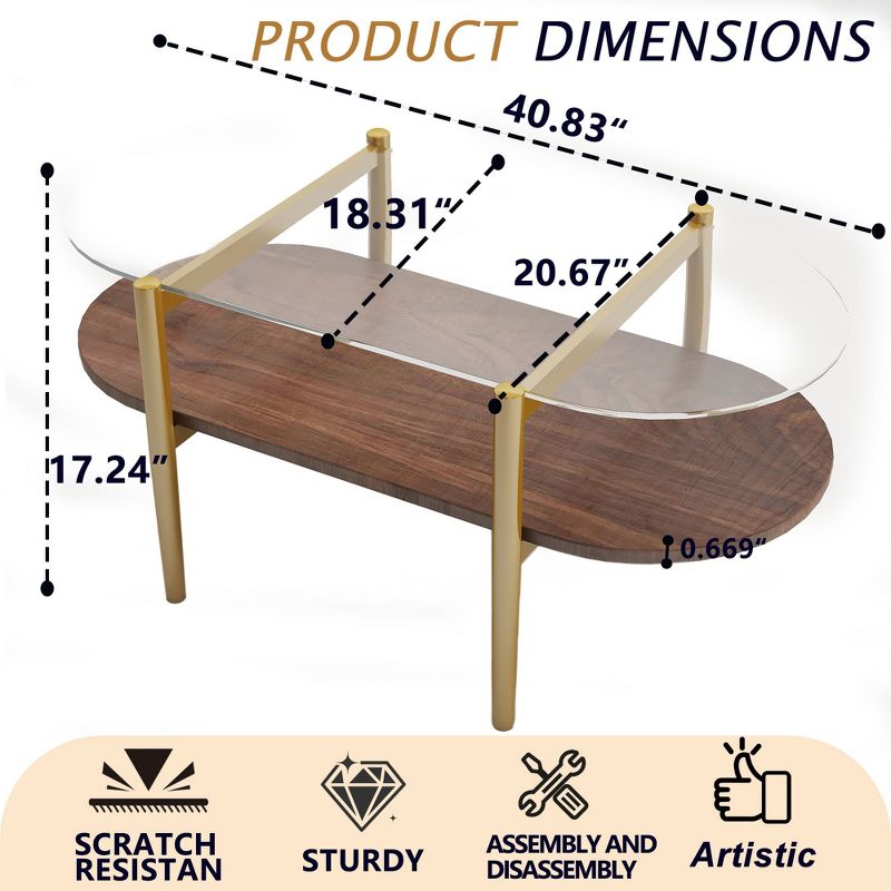 Kumasinova Oval Glass Coffee Table with Storage,41" Mid-Century Center End Table with Brown MDF,Two-Tier Center Table for Living Room Furniture,Wood