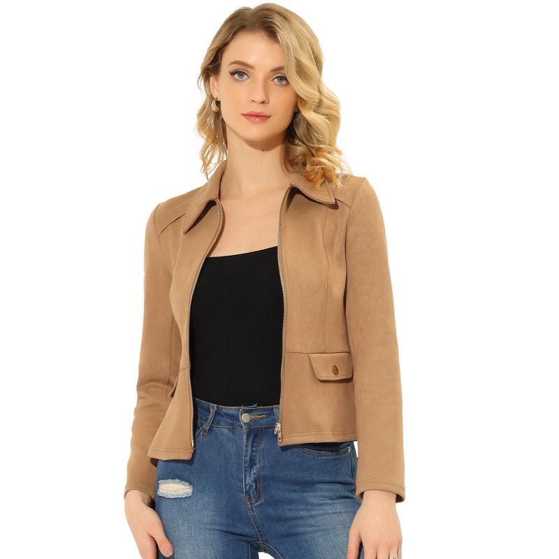Allegra K Women's Faux Suede Short Zip Up Motorcycle Biker Coat Small Brown