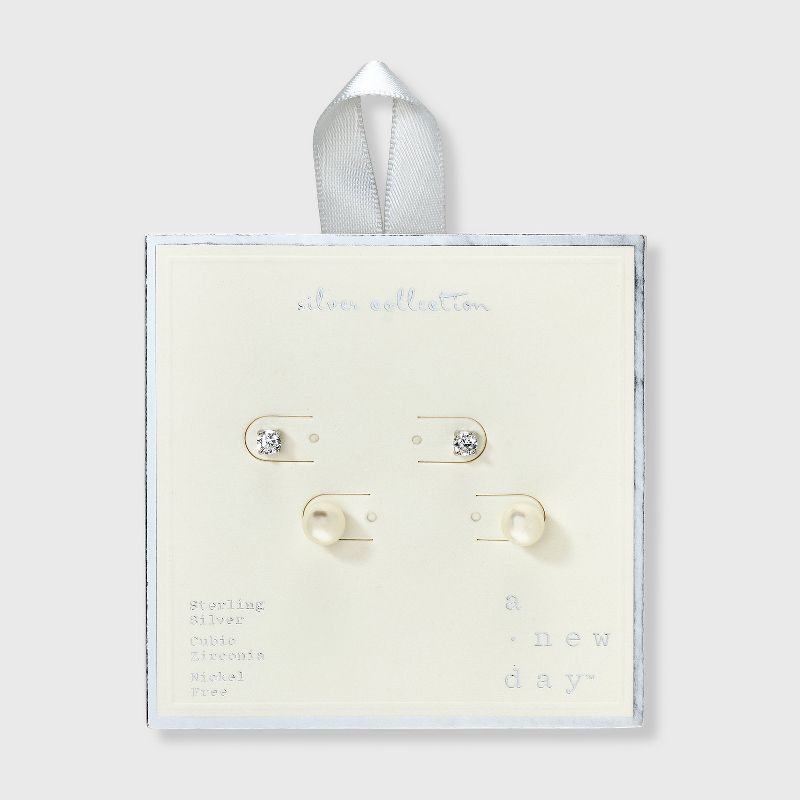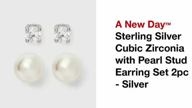 Sterling Silver Cubic Zirconia with Pearl Stud Earring Set 2pc - A New Day™ Silver