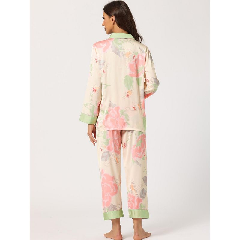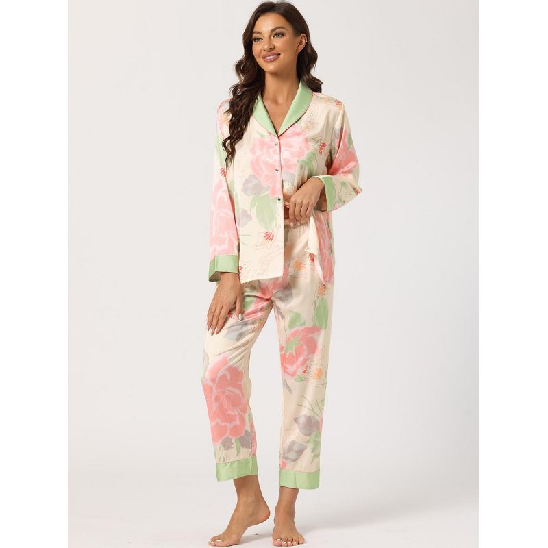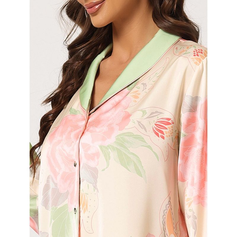cheibear Women's Satin Floral Long Sleeves Shirts with Pants Lounge Pajama Set Pink Medium