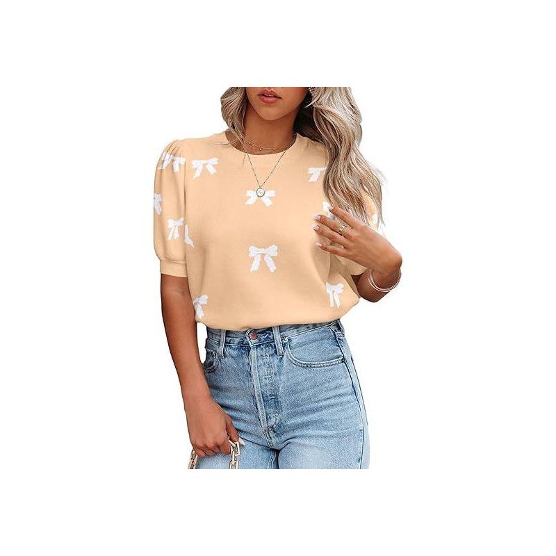 Coolmee Women's Summer Sweater Crew Neck Dressy Puff Sleeve Casual Soft Knit Pullover Tops Apricot XXL