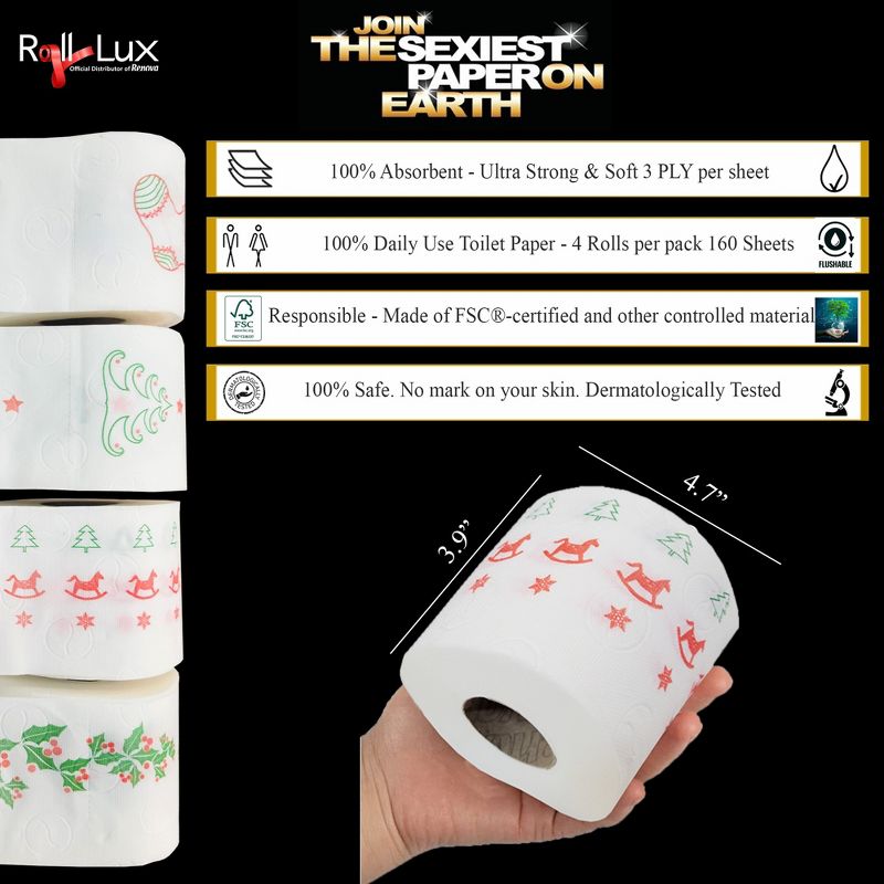 Roll-Lux Christmas Toilet Paper - 3 Ply - 160 Sheets per Roll - Festive and Fun Bathroom Essential for the Holidays 16 Rolls