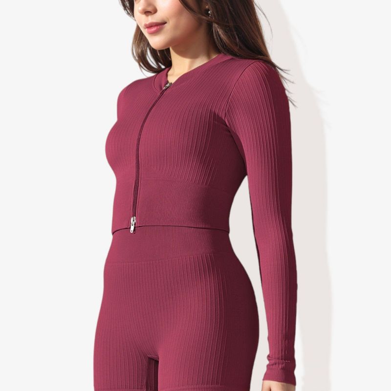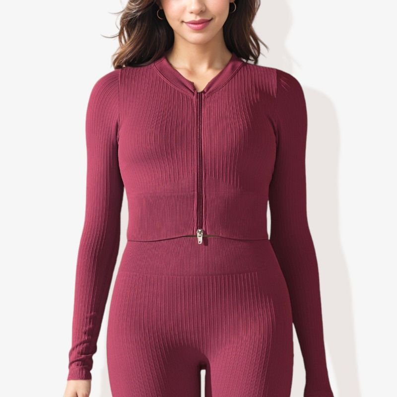 Anna-Kaci Active Women's Rib Knit Long Sleeve High Neck Cropped Sports Jacket-Medium, Burgundy