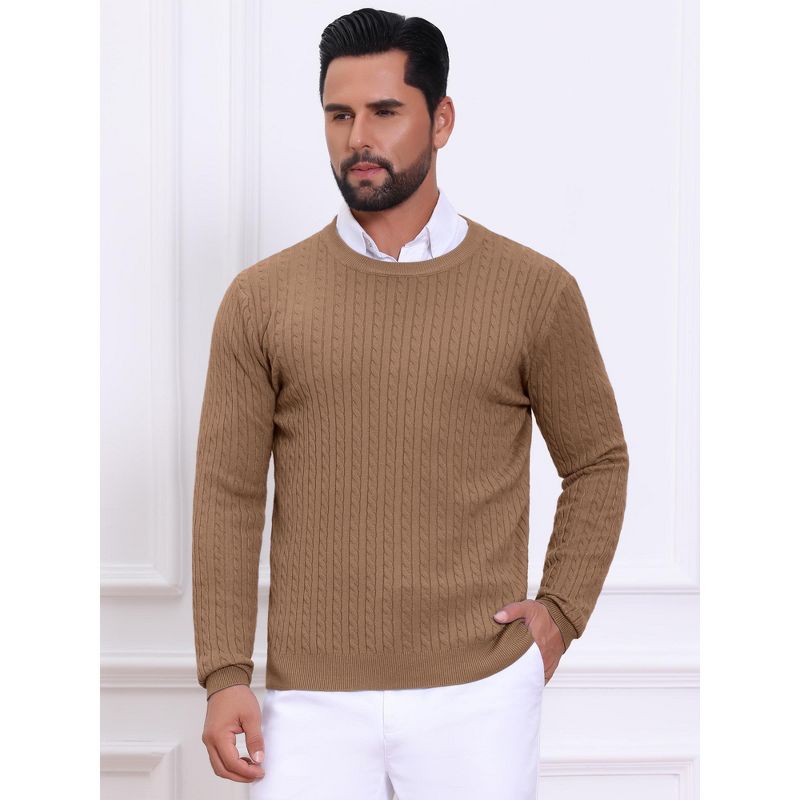 INSPIRE CHIC Men's Slim Fit Crew Neck Long Sleeve Soft Twist Textured Cable Knit Pullover Sweater Brown Medium