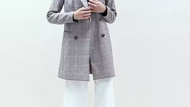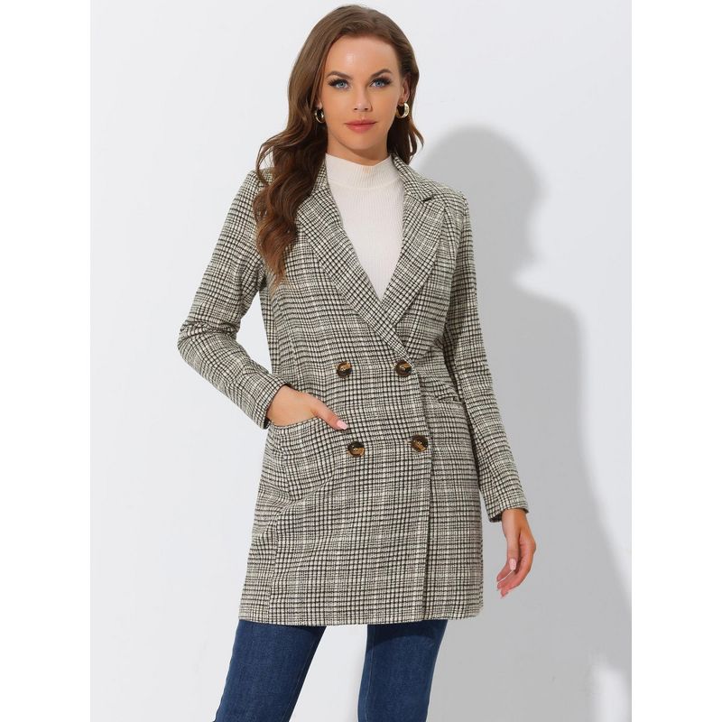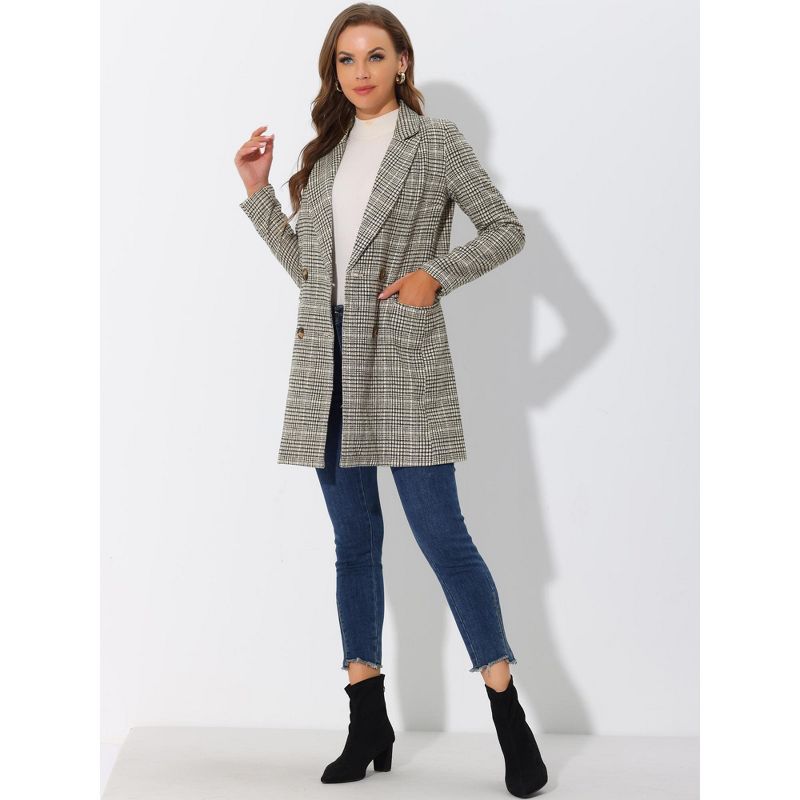 Allegra K Women's Double Breasted Notched Lapel Plaid Overcoat with Pockets Beige Medium