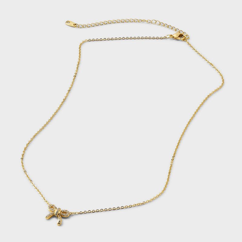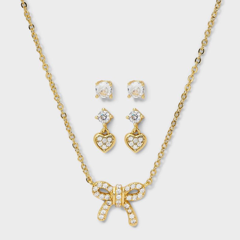 14K Gold Dipped Cubic Zirconia Valentines Bow Necklace with Pave Heart Dangle and Stud Earrings 3pc - A New Day™