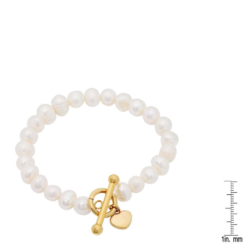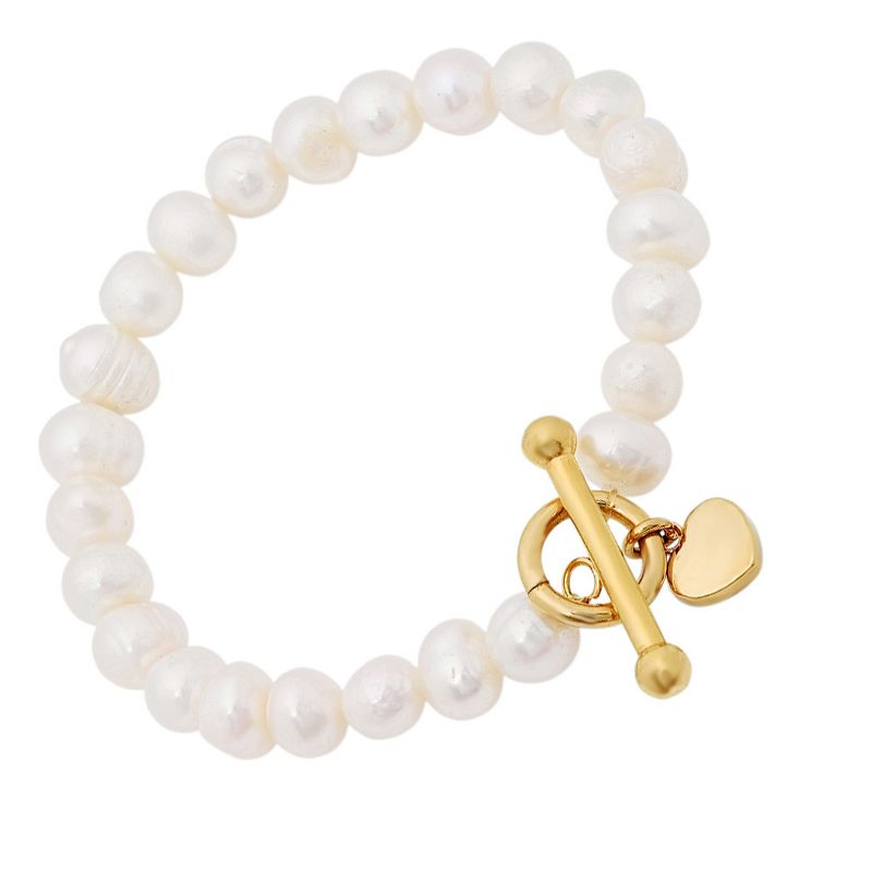 Steeltime Ladies freshewater pearl and 18k gold plated stainless steel heart charm stretch bracelet. Color Options: Silver, Gold