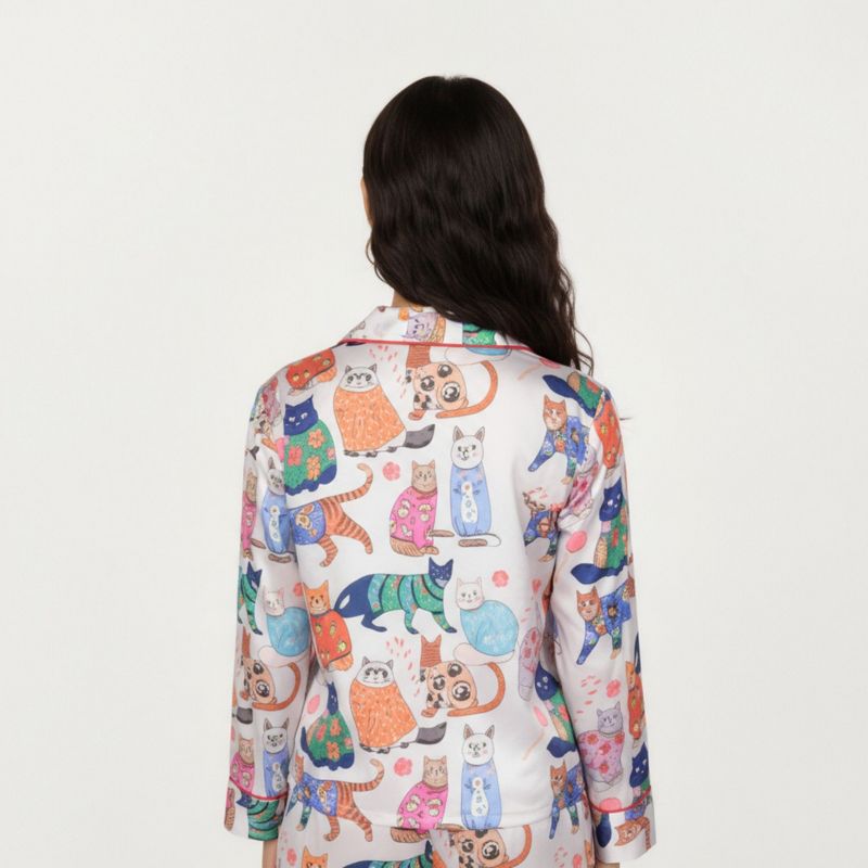 Anna-Kaci Lounge Women's 2-Piece Set Long Sleeve Button Front Pajama Set with Cat Print and Soft Silky Fabric - Small, Light Beige