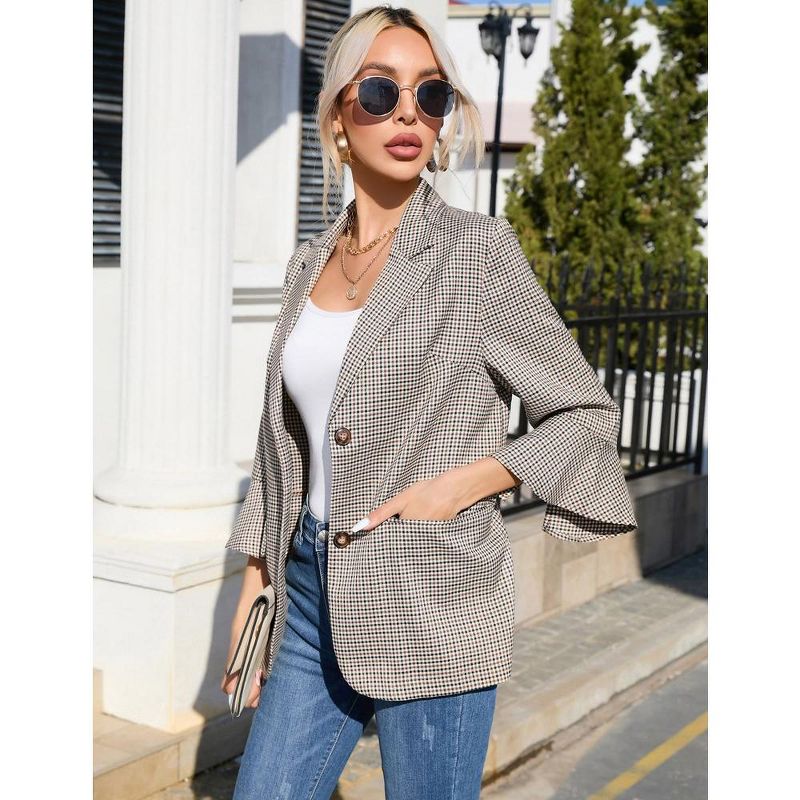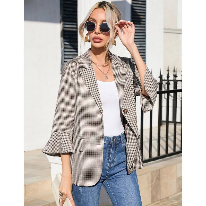Womens 3/4 Sleeve Casual Blazer Lightweight Jacket with Ruffle Sleeve Open Front Plaid Blazer Notched Lapel Womens Blazer Cardigan,Brwon Plaid - L