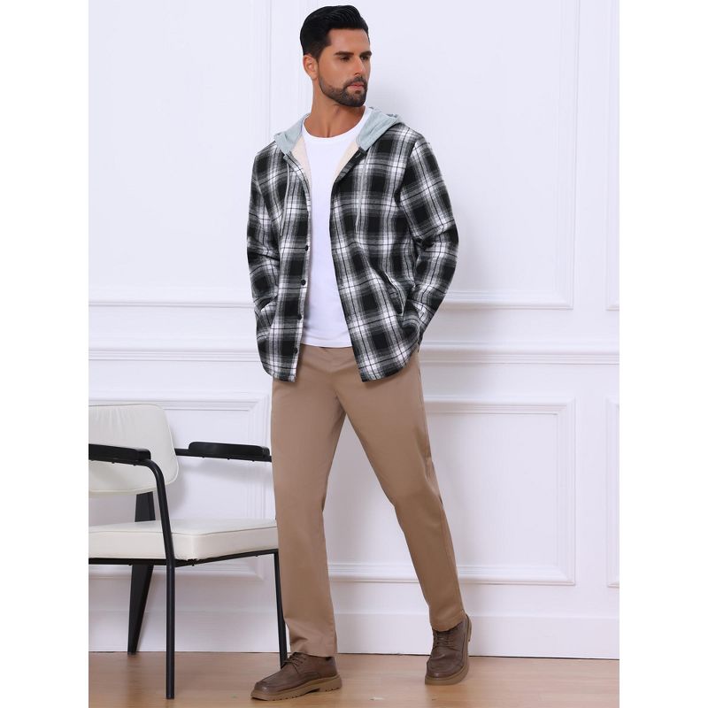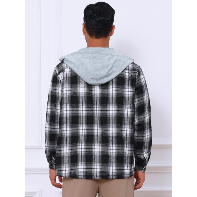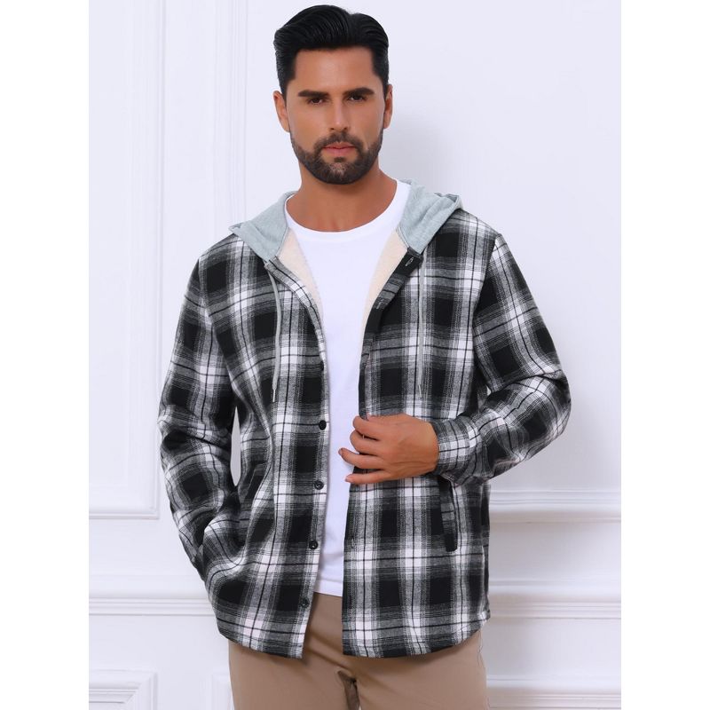 INSPIRE CHIC Men's Fleece Lining Drawstring Hooded Plaid Shirt Jacket Large Black White