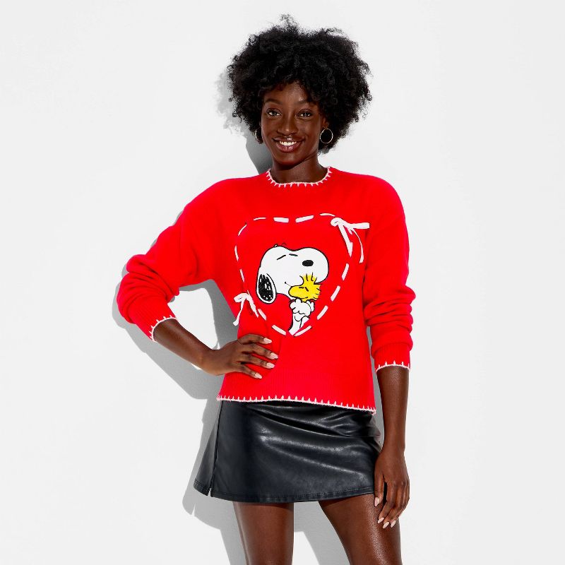 Women's Snoopy and Woodstock Heart Graphic Pullover Sweater - Cherry Red M
