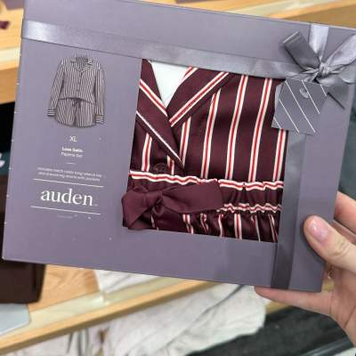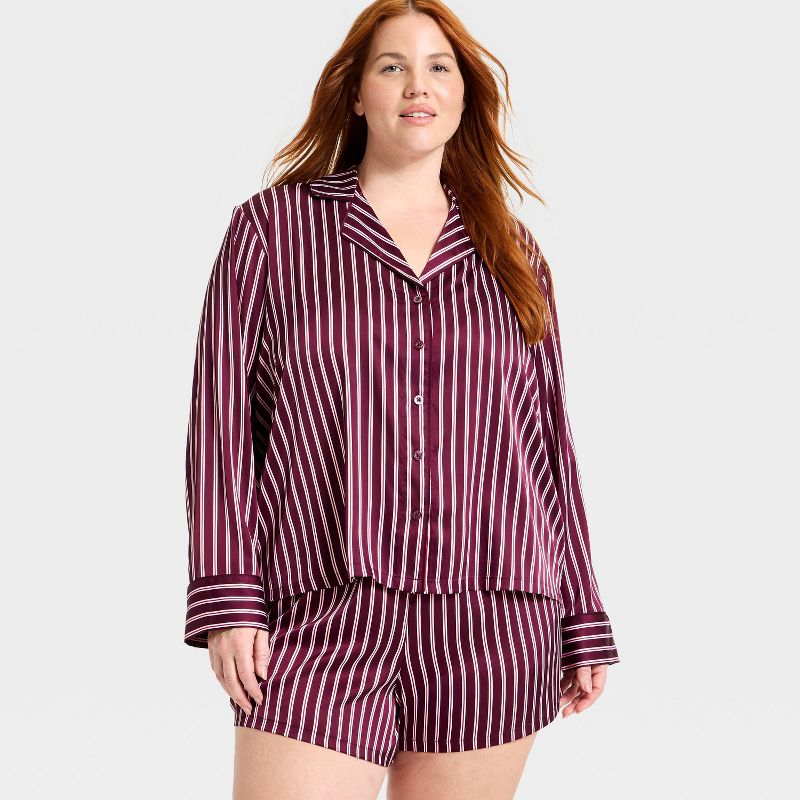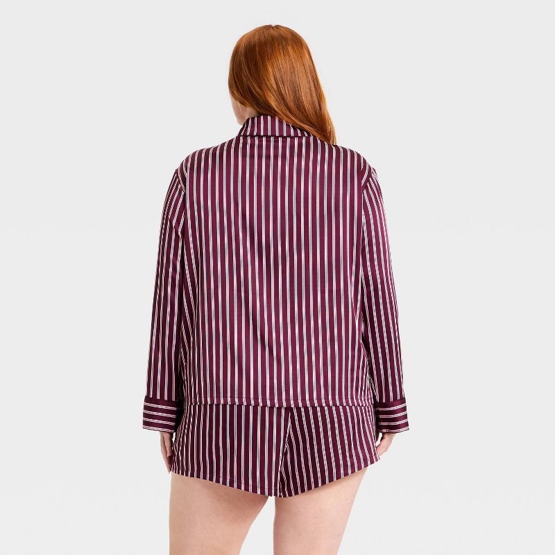 Women's Luxury Collection Satin Notch Collar Long Sleeve Shirt and Shorts Pajama Set - Auden™ Mulberry Striped 3X