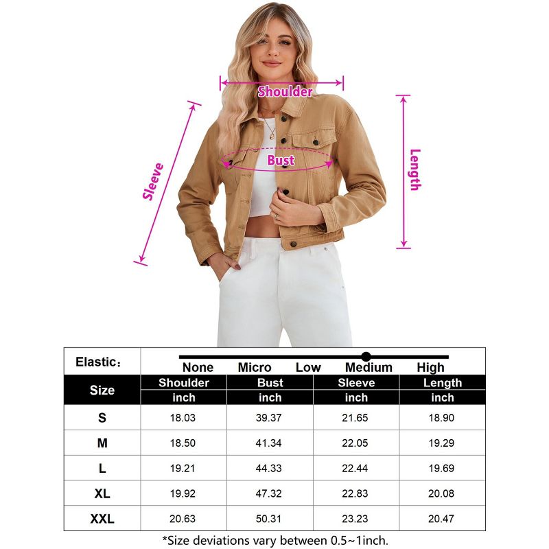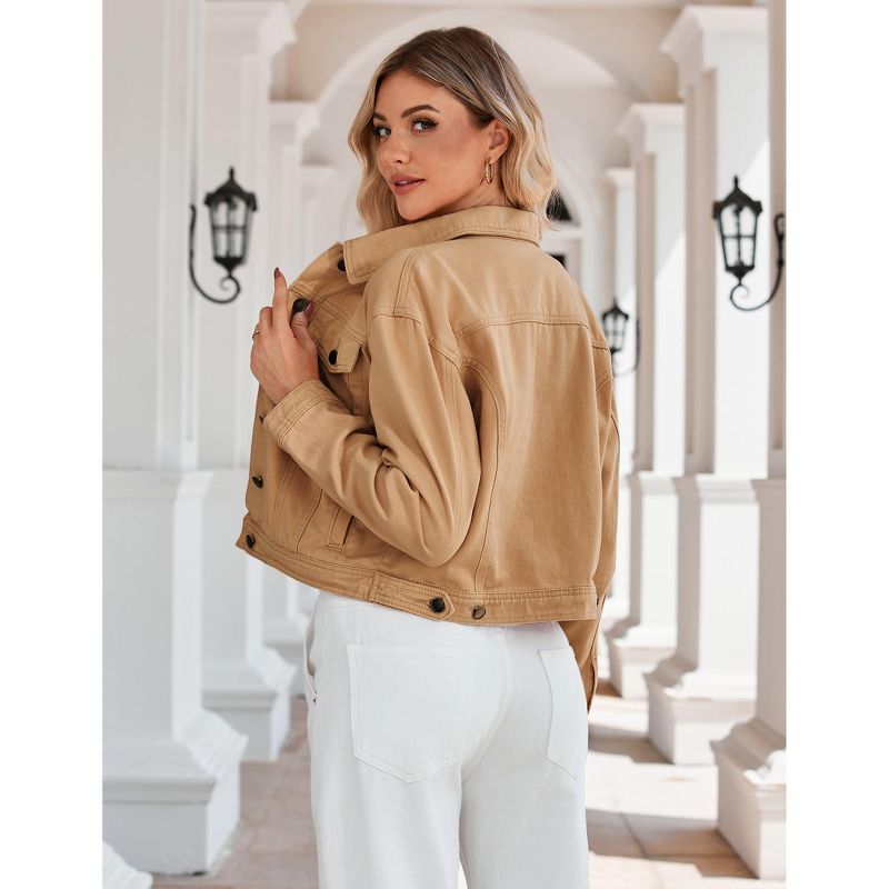 Women's Jean Jacket Frayed Washed Button Up Cropped Denim Jacket With Pockets Khaki XL