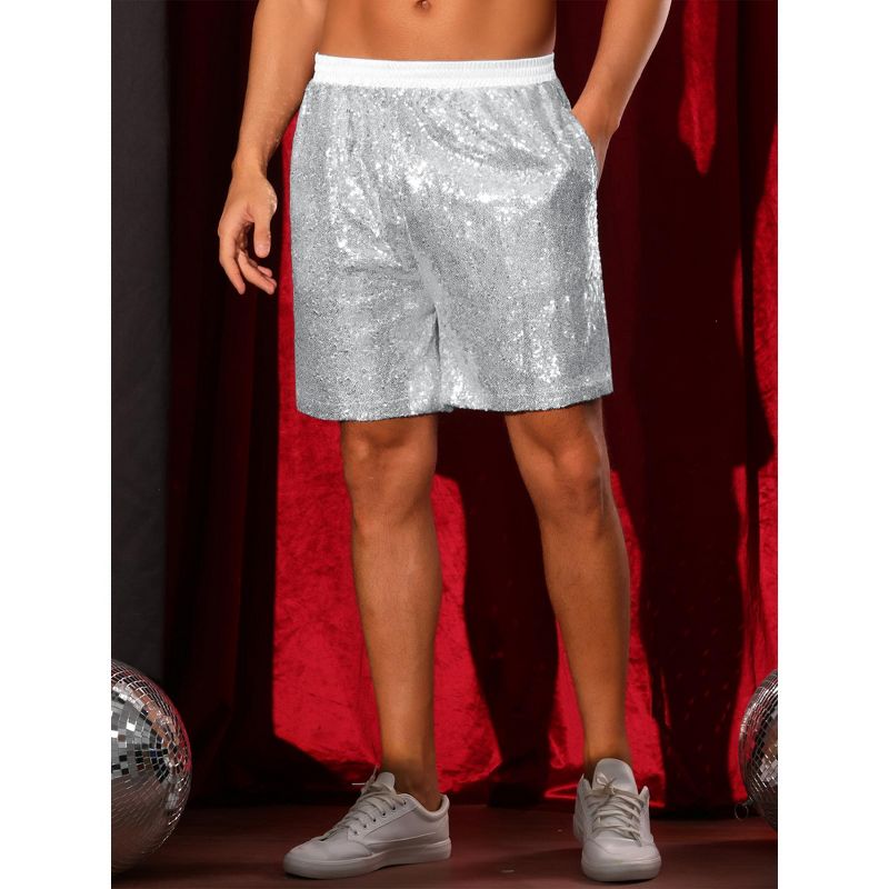Lars Amadeus Men's Elastic Waist Party Disco Sparkly with Pocket Sequins Shorts 34 Silver
