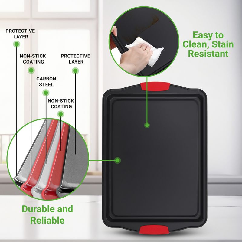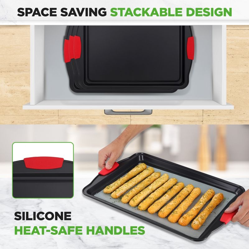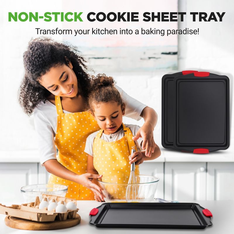 NutriChef 3-Piece Large Non-Stick Cookie Sheet Tray Set with Silicone Handles, Baking Pan for Oven, Black