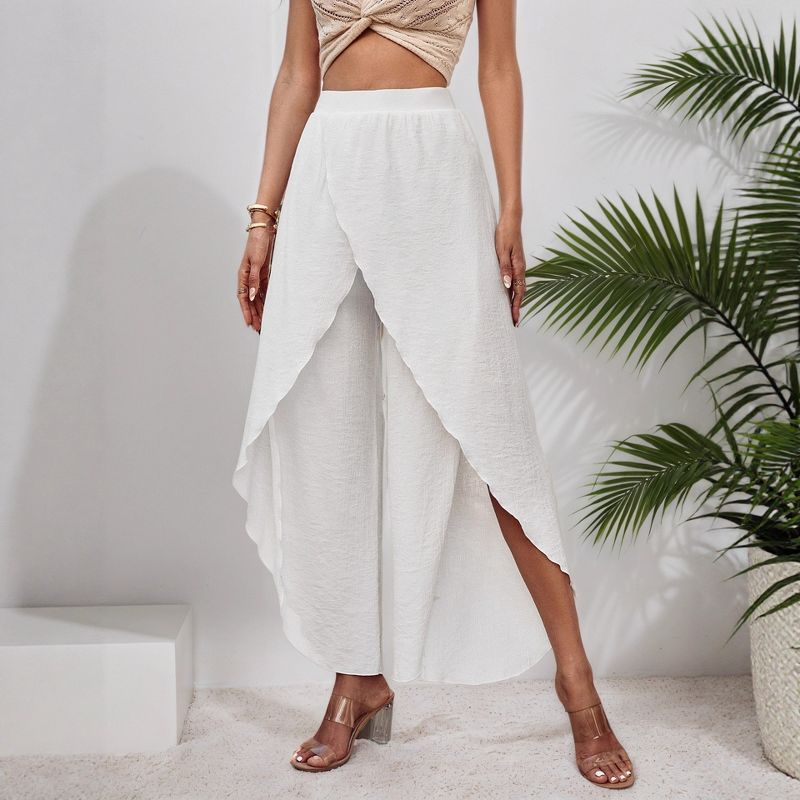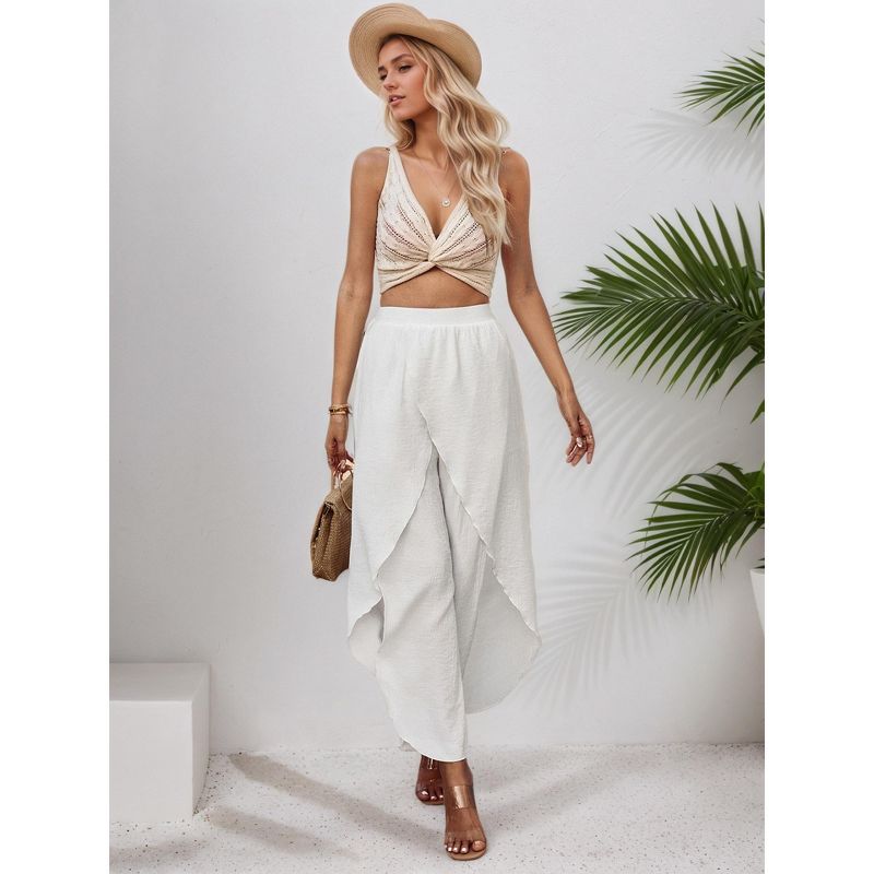 Coolmee Flowy Pants for Women Wide Leg High Waisted Palazzo Boho Front Slit Ruffle Beach Summer Harem Pants for Casual Dance L White