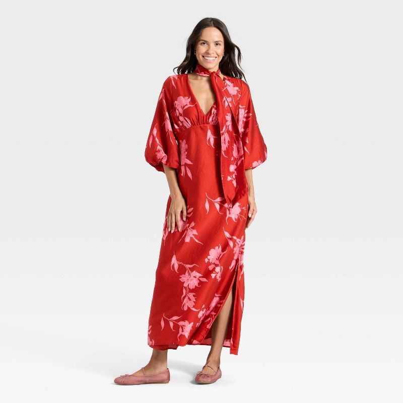 Women's Balloon 3/4 Sleeve Tie Neck Maxi Dress - A New Day™ Red Floral XL