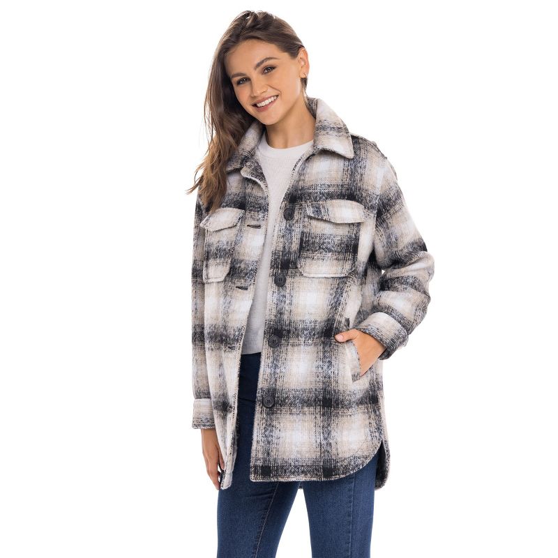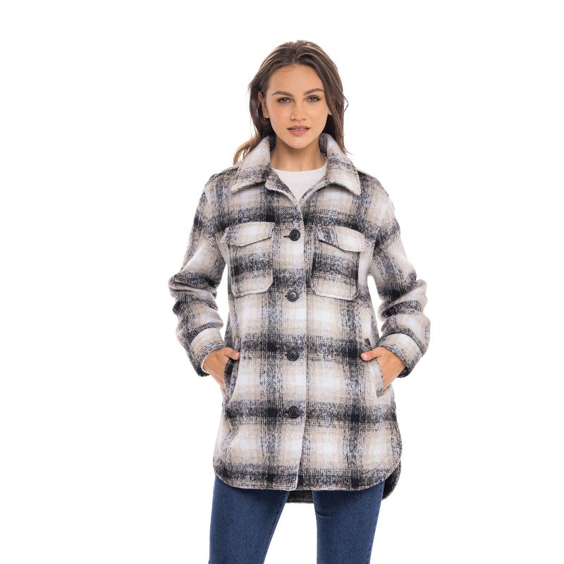 Women's Oversized Plaid Shirt Shacket Lined Coat - S.E.B. By SEBBY Beige/Black Large