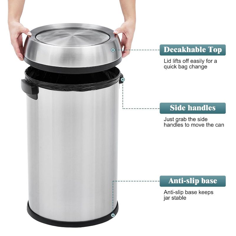 17 Gallon Swing Top Trash Can, Round Waste Container with Handle, Commercial Grade Stainless Steel Recycling Bin for Kitchen, Office, Outdoor, Silver