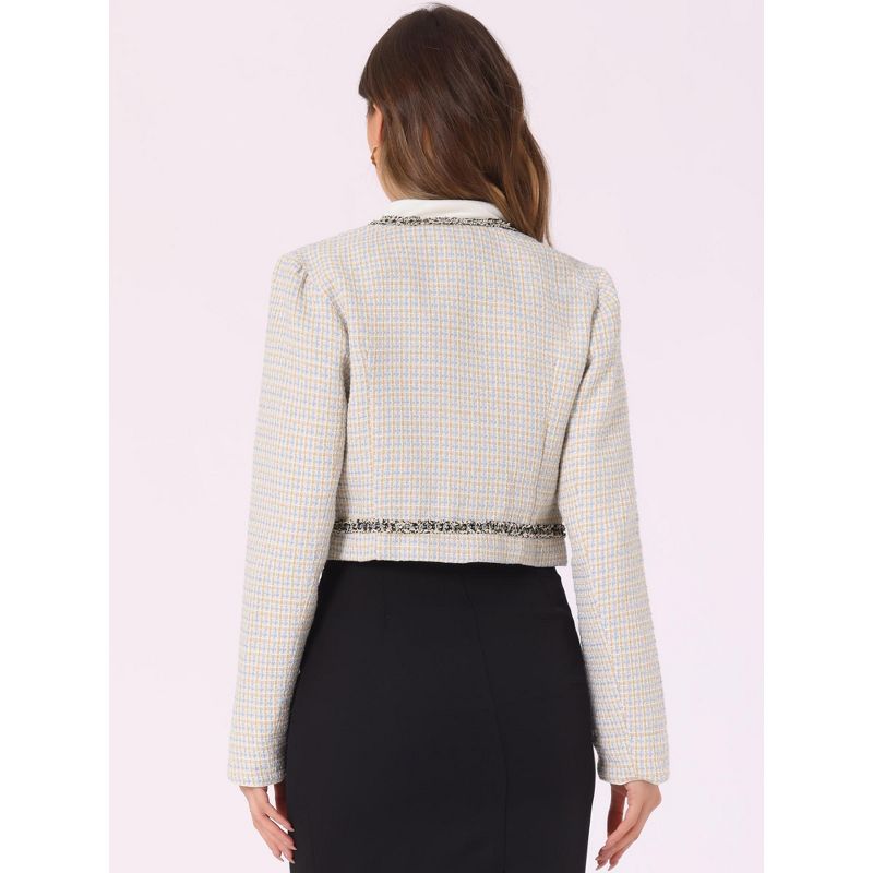 INSPIRE CHIC Women's Double Breasted Open Front Elegant Plaid Tweed Crop Blazer Light Blue Large