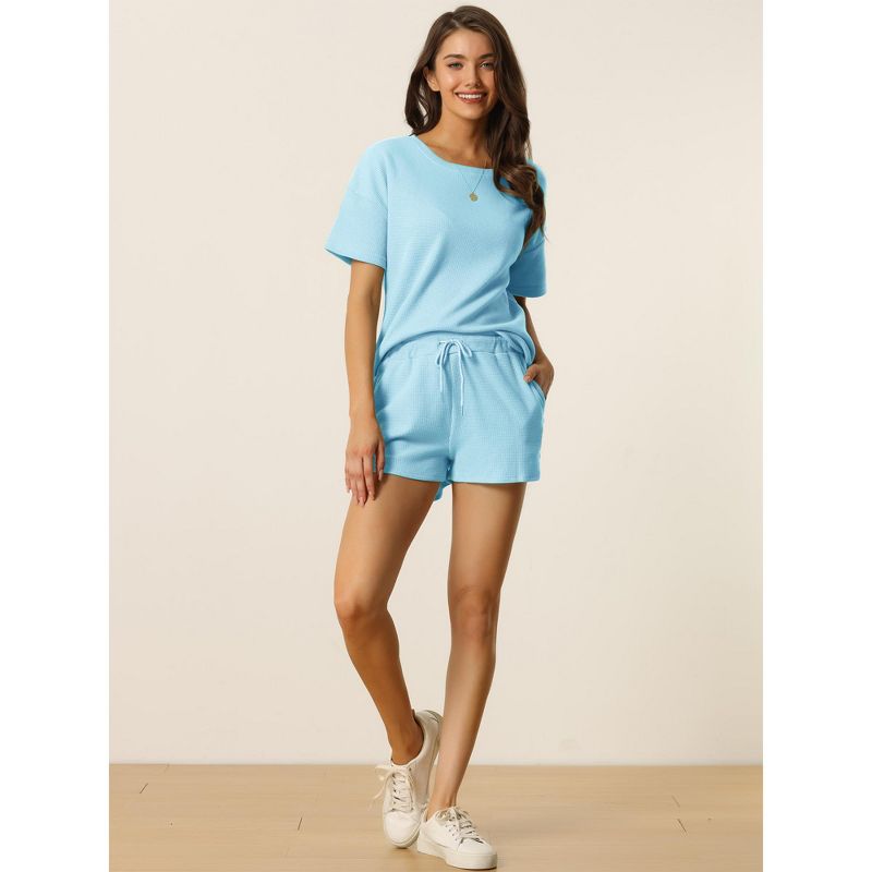 cheibear Women's Waffle Knit Casual Pullover Short Sleeve Tops with Shorts Lounge Pajama Sets Small Light Blue