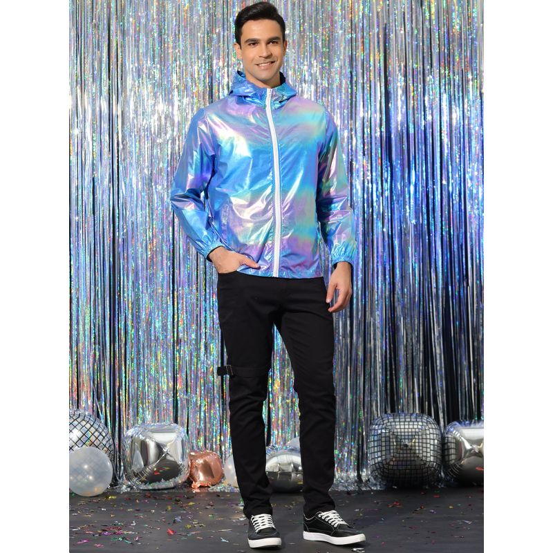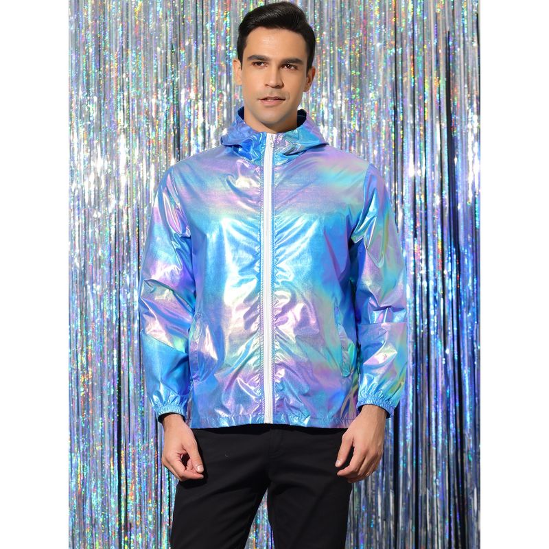 INSPIRE CHIC Men's Metallic Lightweight Zip-Up Holographic Hooded Jackets Blue Purple Medium
