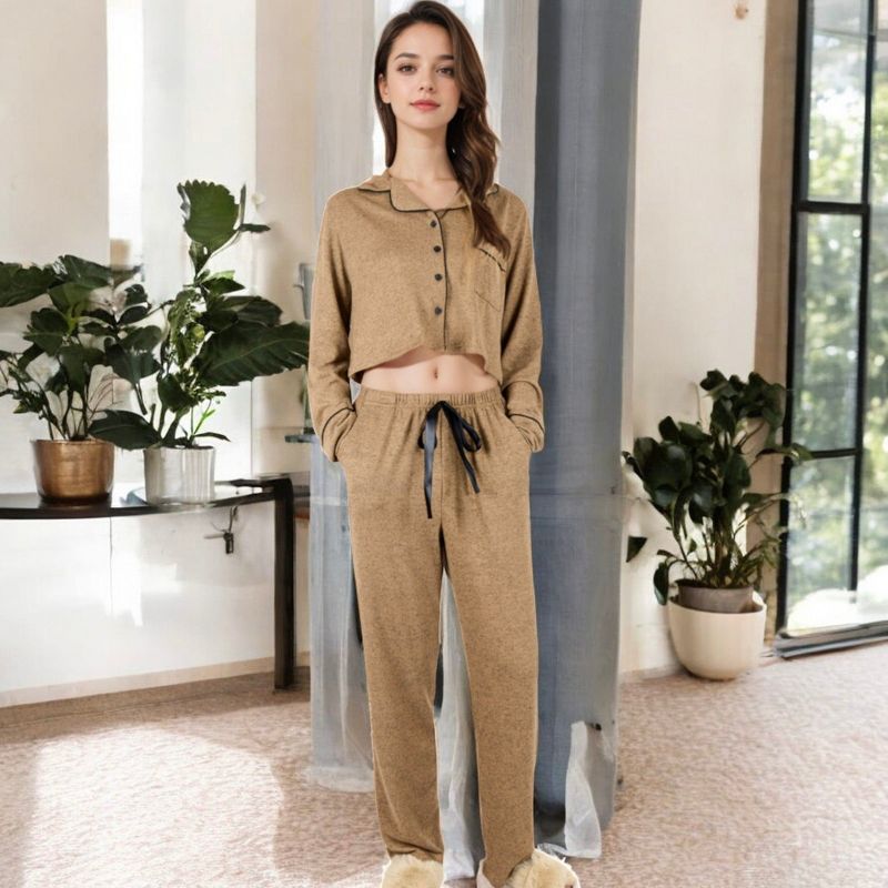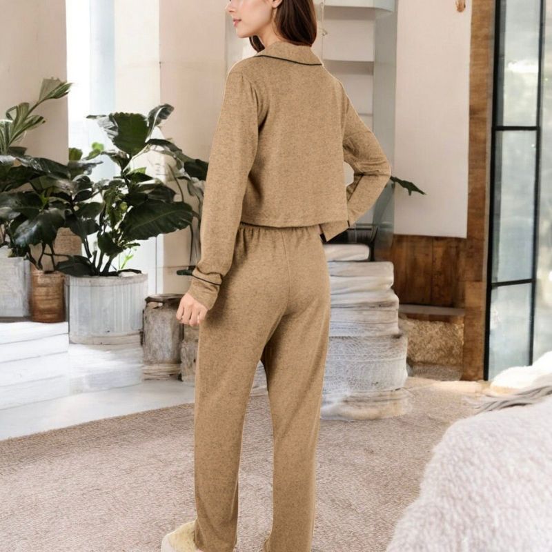 Anna-Kaci Lounge Women's Long Sleeve Button-Up Pajama Set with Piped Trim Details and Relaxed Fit - Medium, Khaki
